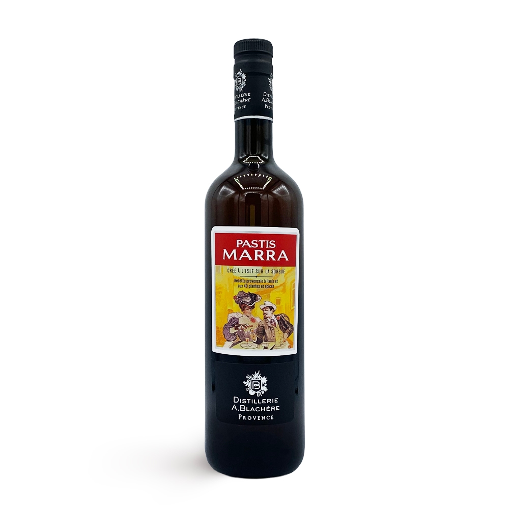 Marra est un Pastis artisanal provençal au caractère authentique, élaboré par la distillerie A.Blachère selon une recette centenaire originaire de l’Isle-sur-la-Sorgue et perpétuée depuis par la distillerie fondée en 1835. Fidèle à la tradition, ce pastis met en avant l’essence de badiane tout en intégrant une macération d’alcoolats de plantes et d’épices soigneusement sélectionnées (notamment réglisse, cardamome, noix de muscade, serpolet), afin d’obtenir un équilibre aromatique riche et complexe sans que les aromates ne submergent la note principale d’anis. Il incarne l’esprit méridional d’un apéritif convivial, reflet du terroir provençal.
